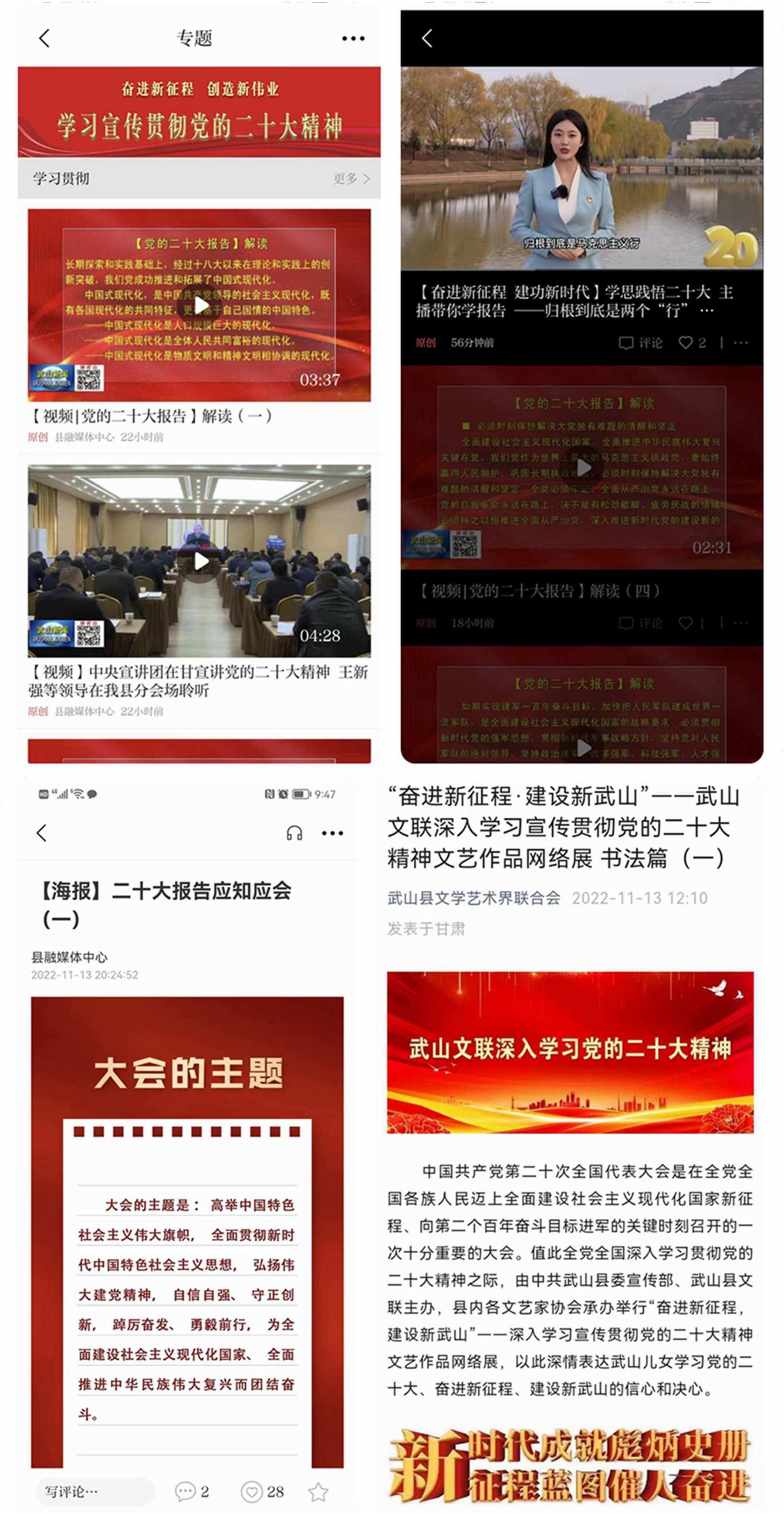 线上宣讲出新气。依托融媒体平台优势深化文明实践,探索“新媒体+理论宣讲”模式搭建理论宣讲云平台,开办党的二十大精神专题专栏,定期推送权威信息和理论文章;整合“武山发布”“武山融媒”“新武山”等新媒体矩阵资源,推出“微讲堂”“有声课堂”“主播带你学报告”等宣讲载体,积极采用“海报+音频”的方式制作一批公益广告,用金句传诵、经典诵读等多种方式,让理论宣讲“触手可得”;以党的二十大精神为主要内容录制“新时代文明播报”,利用城市广播、“村村响、村村讲”农村大喇叭定点播报,依托“村级微信群”高密度推送“文明播报”,同时各级志愿服务队充分利用各类线上平台,积极开展“文明实践·爱拍武山”随手拍视频宣传展示活动,拍摄制作集中反映武山发展变化的微视频等,讲好发展故事,传播武山声音,把党的二十大精神传送到千家万户。