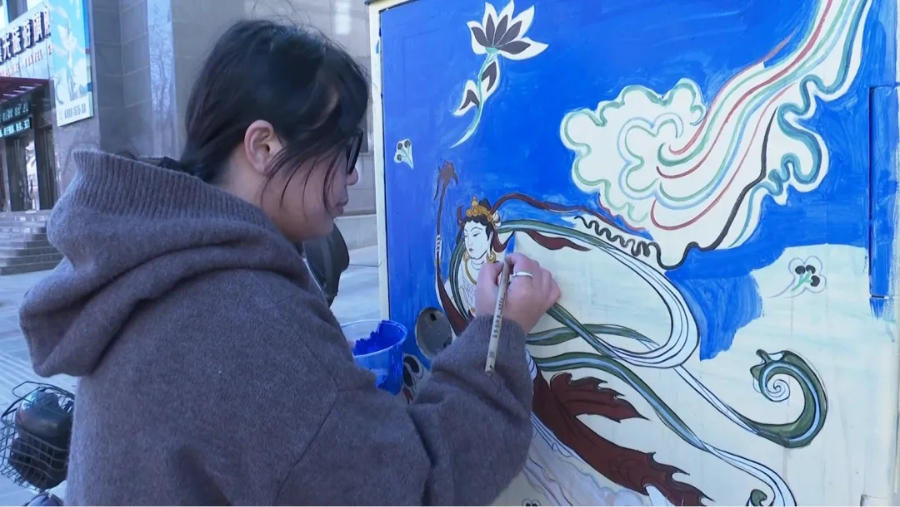 2024年8月,敦煌清美艺术培训学校的师生们也拿起画笔,在城区主次干道的空白区域描绘敦煌元素的画作。从张骞出使西域的故事,到敦煌飞天的飘逸神韵,再到九色鹿故事传递的诚信善良,这些承载着千年历史的文化符号,通过现代艺术手法跃然眼前。