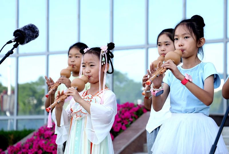 “青春小舞台”上,13名葫芦丝小学员以一曲《欢乐颂》惊艳亮相。孩子们的指尖在竹管上灵巧跃动,西方经典旋律在民族乐器的演绎下焕发出独特魅力。“很好听!这些孩子把葫芦丝吹得很有韵味!”一位观众情不自禁地赞叹道。随后,在欢快的旋律中,小学员们的右手随着音符优雅摆动,指尖在葫芦丝音孔上轻盈跳跃,整齐划一地演奏《右手舞》。