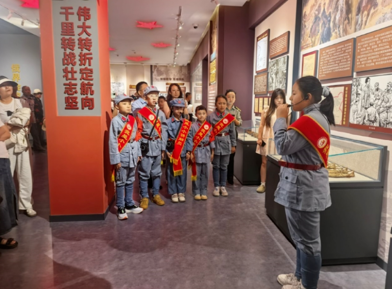 7月底,第二届腊子口战役纪念馆“小小讲解员”正式上岗。他们身着迷你版红军服或民族服,肩挎扩音器,在展厅为游客讲述《腊子口战役》的故事,引来阵阵快门声。站在“腊子口天险”复原场景前,声情并茂地讲述17岁小战士“云贵川”飞身炸碉堡的壮举。