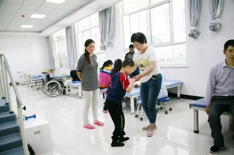 龚丽君(右二)陪同孤残儿童做康复训练。