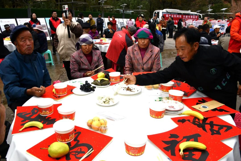 一幅幅本地书画名家写的“福”“寿”“平安”字画,挨个送到村民手里,那一笔一划都透着心意。拿到字画的村民小心翼翼捧着,互相展示,脸上满是珍惜和高兴。墨香混着果香,再加上不时传来的歌声、笑声,整个村子都浸在中秋的温馨里。
