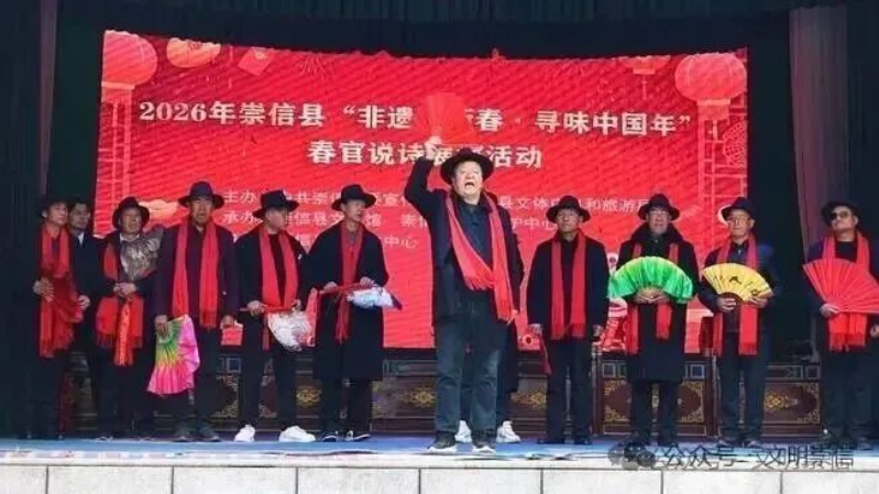 社火巡游唱韵,让乡土记忆“可亲可近”。从正月初四开始,社火巡演在崇信县各个村落间“接力”上演。震天的锣鼓敲响新春序曲,舞龙舞狮、踩高跷等传统民俗轮番登场 。在社火队伍中,“春官说诗”是最具烟火气的“点睛之笔”。选手们头戴礼帽、手握羽扇,即兴吟诗、出口成章,用通俗押韵的家乡话,把党的政策、身边的新风编成朗朗上口的诗句。春节期间,崇信县举办“春官赛诗会”活动,30余年来已成传统,成为群众喜闻乐见的文化符号。