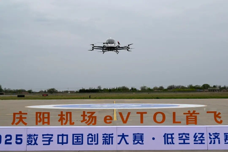 2025年4月26日,基于北斗伏羲空中红绿灯支持下的亿航智能公司eVTOL庆阳首飞在庆阳机场完成。